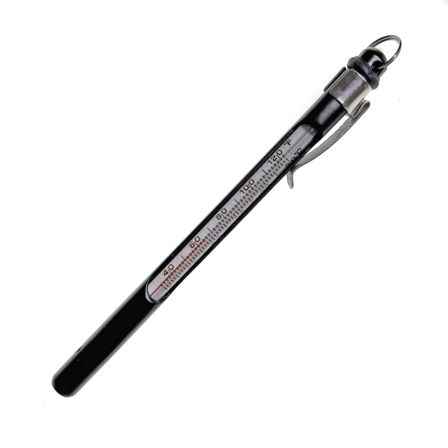 Reasonably priced alternative to keep you on top of water temps. This self-draining thermometer has both Fahrenheit and centigrade scales in a 5" metal case.